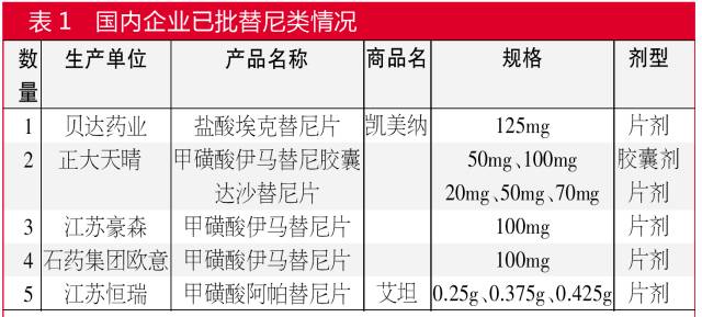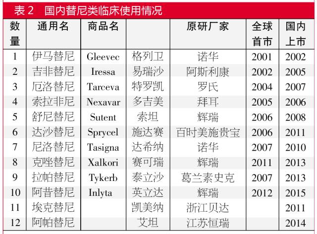 替尼類抗腫瘤藥物是一類新型生物靶向治療腫瘤藥物,目前在我國(guó)市場(chǎng)上常見的替尼類產(chǎn)品有伊馬替尼、吉非替尼、厄洛替尼、索拉非尼、??颂婺帷⑹婺崽婺?、克唑替尼、尼洛替尼、達(dá)沙替尼、拉帕替尼、阿帕替尼11只產(chǎn)品,2015年4月,輝瑞公司的阿昔替尼片在我國(guó)獲得進(jìn)口批件,使國(guó)內(nèi)上市的替尼類品種增至12只。