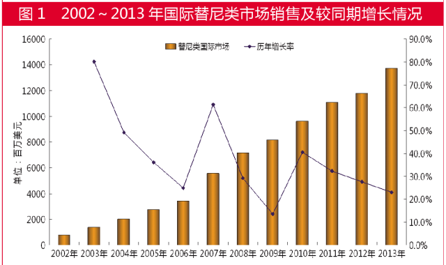 據(jù)全球暢銷藥數(shù)據(jù),全球替尼類用藥市場(chǎng)規(guī)模從7.53億美元增長(zhǎng)到2013年的137.2億美元,較同比增長(zhǎng)23.1%。替尼類藥物自上市以來,一直保持較高的增長(zhǎng)速度,2002~2013年,其復(fù)合增長(zhǎng)率為30.2%,11年整體市場(chǎng)增長(zhǎng)18.2倍,遠(yuǎn)遠(yuǎn)高于全球整體市場(chǎng)增長(zhǎng)速度。