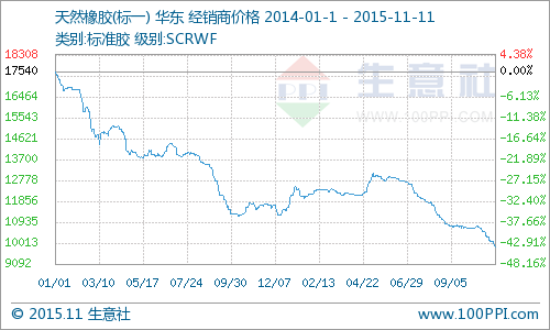 11月10日天然橡膠(標(biāo)一)商品指數(shù)為29.36,較昨日下降了0.23點,創(chuàng)下周期內(nèi)的歷史新低,較2011年09月01日最高點100.00點下降了70.64%。