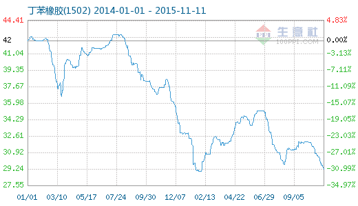 11月10日丁苯橡膠(1502)商品指數(shù)為29.38,較昨日下降了0.18點,較周期內(nèi)最高點103.60點(2011-09-08)下降了71.64%,較2015年02月03日最低點28.96點上漲了1.45%。