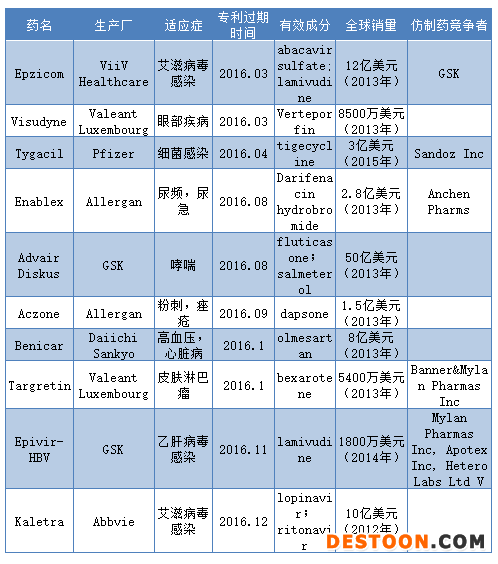 中國醫(yī)藥化工網(wǎng)3月16日訊 當(dāng)一個(gè)新藥的專利即將過期的時(shí)候,往往是最能激起藥廠之間的競爭的。其一是該藥的生產(chǎn)本廠會(huì)不遺余力的進(jìn)行更深層研發(fā),希望能開發(fā)出該藥的新用途,試圖延長專利期,從而延長獨(dú)享這部分市場的期限;其二是其他藥廠會(huì)緊跟步伐,著手研制仿制藥并搶先申請上市,試圖從該市場中分一杯羹。2016年剛剛開始,讓我們來一起看一下即將在今年專利過期的幾大暢銷藥!