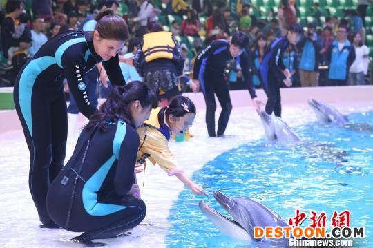 表演結(jié)束后,孩子們?cè)诠ぷ魅藛T指引下與海豚來(lái)了一次親密接觸:他們或者輕輕撫摸海豚,或者俯下身親吻海豚,指揮海豚轉(zhuǎn)圈……久違的笑容出現(xiàn)在他們的臉上。
