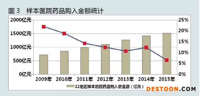 據(jù)中國(guó)醫(yī)藥工業(yè)信息中心PDB數(shù)據(jù)庫(kù)統(tǒng)計(jì),2015年22城市樣本醫(yī)院藥品購(gòu)入金額同比增長(zhǎng)為6.58%,比去年同期下降5個(gè)百分點(diǎn)。