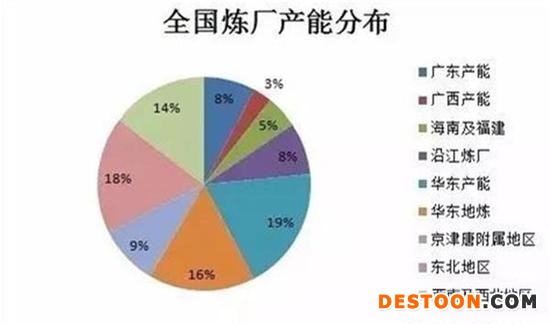 煉廠的地理分布與中國(guó)的經(jīng)濟(jì)發(fā)展水平亦大體一致。其中華東煉廠的產(chǎn)能約占全國(guó)產(chǎn)能的35%左右,華南煉廠為16%左右,東北煉廠為18%左右。華南煉廠的產(chǎn)能相對(duì)經(jīng)濟(jì)發(fā)展水平略低,而東北煉廠的產(chǎn)能相對(duì)經(jīng)濟(jì)發(fā)展水平略高。因此,中國(guó)煉廠的區(qū)域相對(duì)不均衡導(dǎo)致了在油品消費(fèi)高峰期,大量的北方油品南下,為了緩解此類情況,中國(guó)煉廠也在華南區(qū)域大量投資新建煉廠,以緩解此類矛盾。