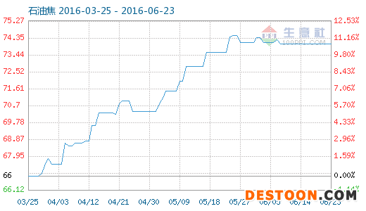 6月23日石油焦商品指數(shù)為74.04,與昨日持平,較周期內(nèi)最高點(diǎn)108.79點(diǎn)(2013-04-15)下降了31.94%,較2016年03月28日最低點(diǎn)66.89點(diǎn)上漲了10.69%。(注:周期指2012-09-30至今)