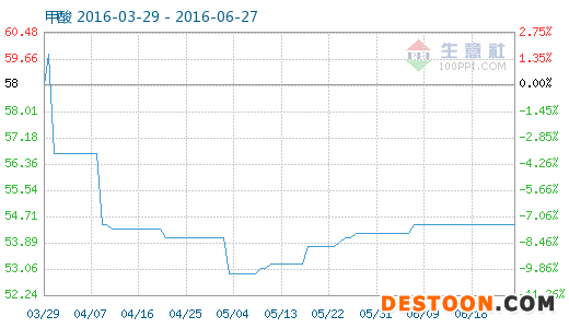 6月27日甲酸商品指數(shù)為54.47,與昨日持平,較周期內(nèi)最高點(diǎn)100.00點(diǎn)(2013-12-08)下降了45.53%,較2015年11月29日最低點(diǎn)47.49點(diǎn)上漲了14.70%。(注:周期指2013-12-01至今)