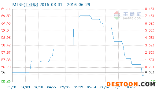 6月29日MTBE(工業(yè)級)商品指數(shù)為56.11,較昨日下降了0.04點,較周期內(nèi)最高點109.29點(2012-03-29)下降了48.66%,較2016年01月31日最低點51.79點上漲了8.34%。(注:周期指2011-09-01至今)