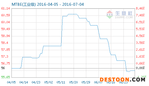 7月3日MTBE(工業(yè)級)商品指數(shù)為56.18,與昨日持平,較周期內(nèi)最高點109.29點(2012-03-29)下降了48.60%,較2016年01月31日最低點51.79點上漲了8.48%。(注:周期指2011-09-01至今)