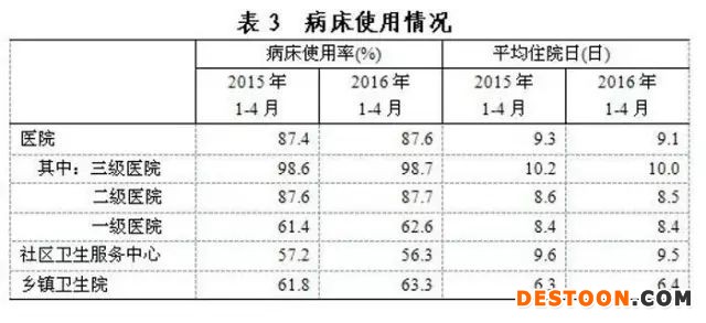 2016年1-4月,醫(yī)院病床使用率為87.6%,同比增加0.2個(gè)百分點(diǎn),社區(qū)衛(wèi)生服務(wù)中心為56.3%,同比降低0.9個(gè)百分點(diǎn),鄉(xiāng)鎮(zhèn)衛(wèi)生院為63.3%,同比增加1.5個(gè)百分點(diǎn)。三級(jí)醫(yī)院平均住院日為10.0日,同比縮短0.2日,二級(jí)醫(yī)院平均住院日為8.5日。同比縮短0.1日。