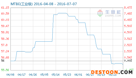 7月7日MTBE(工業(yè)級)商品指數(shù)為56.03,與昨日持平,較周期內(nèi)最高點109.29點(2012-03-29)下降了48.73%,較2016年01月31日最低點51.79點上漲了8.19%。(注:周期指2011-09-01至今)