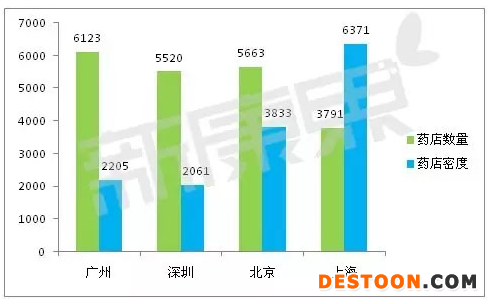 圖1 一線城市藥店數(shù)量與密度對比