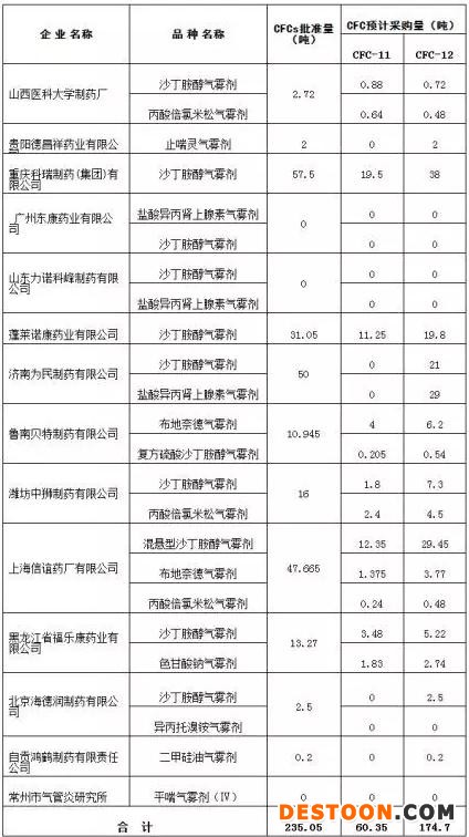 2014年各藥品生產(chǎn)企業(yè)藥用吸入式氣霧劑用CFCs豁免批準(zhǔn)量