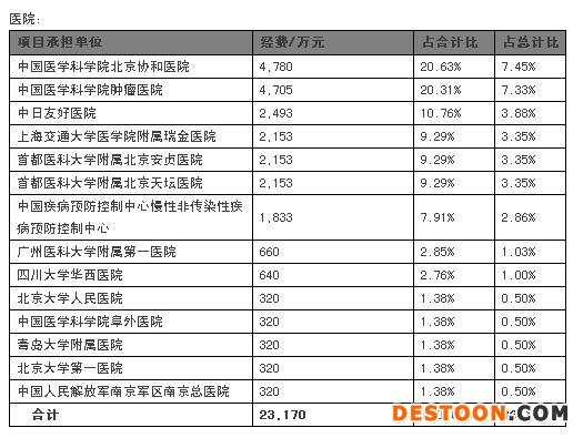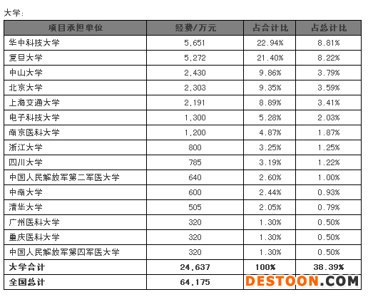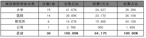 2、 項目承擔(dān)單位分類占比情況如下所示:大學(xué)15家,經(jīng)費(fèi)占比38.39%;醫(yī)院14家經(jīng)費(fèi)占比36.10%,均按降序排列;