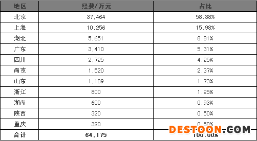 11個省中,北京經(jīng)費(fèi)總額37,464萬元,占比58.38%;上海經(jīng)費(fèi)總額10,256萬元,占比15.98%;各省份金額及占比如下表格所示: