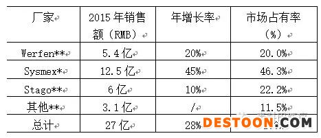 目前,中國的血凝市場容量大約為27億元,外資企業(yè)在該領(lǐng)域具有絕對優(yōu)勢,預(yù)計占有其中90%以上的市場份額。相對于免疫的ARDS四大巨頭,血凝是WSS三大巨頭,分別為美國國家儀器實驗室(IL,Werfen集團(tuán))、日本希森美康(Sysmex集團(tuán))、法國思塔高(Stago集團(tuán)),其他外資企業(yè),如日本積水、德國BE等具有一小部分的市場份額。國內(nèi)企業(yè)市場份額較少,塞克希德,普利生(邁瑞集團(tuán)成員)及上海太陽為其中的佼佼者。下面我們簡單介紹一下該市場的主要玩家和未來發(fā)展方向。