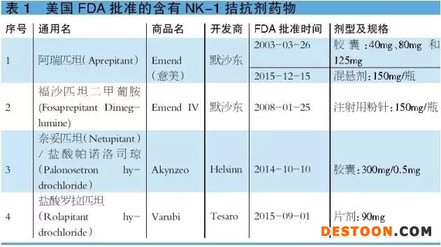 奈妥匹坦/鹽酸帕諾洛司瓊是FDA于2014年10月批準(zhǔn)的用于治療癌癥化療引起的惡心嘔吐類藥物,該藥是由NK-1拮抗劑奈妥匹坦和5-HT3受體拮抗劑鹽酸帕諾洛司瓊組成的復(fù)方制劑,可預(yù)防化療后24小時(shí)內(nèi)至12小時(shí)產(chǎn)生的惡心嘔吐。