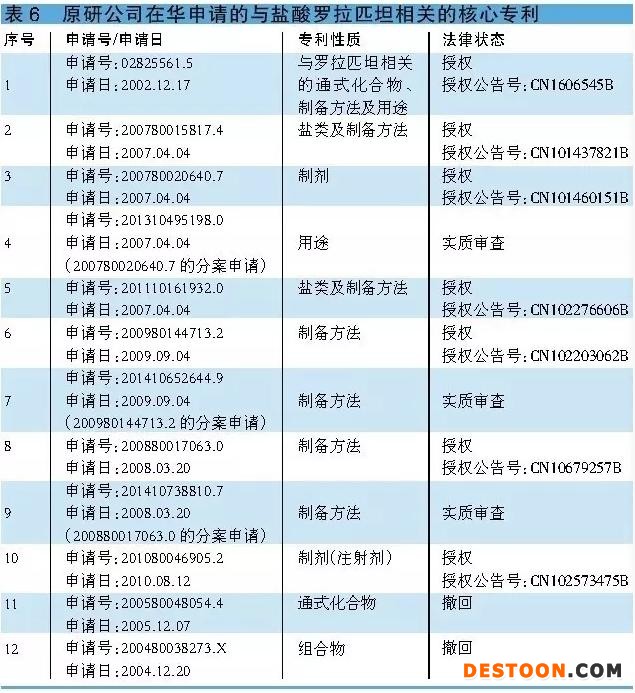 于2007年4月4日申請(qǐng)的200780020640.7是一項(xiàng)與鹽酸羅拉匹坦一水合物相關(guān)的制劑專利,該專利已獲得授權(quán)(授權(quán)公告號(hào):CN101460151B),將于2027年4月4日到期。此外,為獲得更多的專利保護(hù),原研公司在華還申請(qǐng)了與鹽酸羅拉匹坦相關(guān)的制備方法、注射劑等相關(guān)專利(詳見表6)。