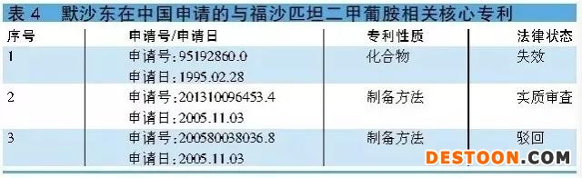 福沙匹坦二甲葡胺相關(guān)的化合物專利95192860.0已于2015年2月失效,而一項(xiàng)與福沙匹坦二甲葡胺制備方法相關(guān)的專利申請(qǐng)200580038036.8已被駁回,另一項(xiàng)專利申請(qǐng)201310096453.4目前處于實(shí)質(zhì)審查階段(詳見表4)。