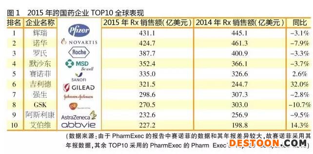 與2014年相比,2015年TOP 10企業(yè)保持不變,輝瑞、諾華、羅氏、默沙東、賽諾菲、吉利德、強生、GSK、阿斯利康和艾伯維依然位居前十,不過位次有所變化。輝瑞因為跌幅小反超了諾華。