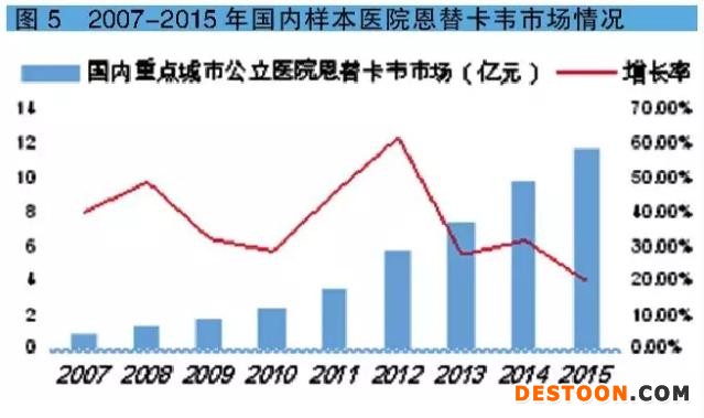 據(jù)HDM數(shù)據(jù),2015年我國(guó)重點(diǎn)城市公立醫(yī)院恩替卡韋制劑用藥金額為11.84億元,同比上一年增長(zhǎng)了19.98%,2011-2015年五年平均增幅為37.72%,已成為抗乙肝病毒感染的主要品種。