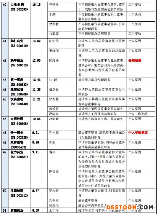 其中尤以復(fù)星醫(yī)藥的副總裁職務(wù)和東北制藥的副總經(jīng)理職務(wù)變動(dòng)最為頻繁——據(jù)不完全統(tǒng)計(jì),半年間,復(fù)星醫(yī)藥的5位高管接連離職;東北制藥的副總經(jīng)理職務(wù)也任期短暫,2月份,路永強(qiáng)被東北制藥董事會(huì)解聘副總經(jīng)理職務(wù);4月份,鄭長勝、王浩淼先后因個(gè)人原因申請(qǐng)辭去東北制藥副總經(jīng)理職務(wù);5月份,張利東因工作變動(dòng)不再擔(dān)任東北制藥副總經(jīng)理及財(cái)務(wù)總監(jiān)職務(wù)。