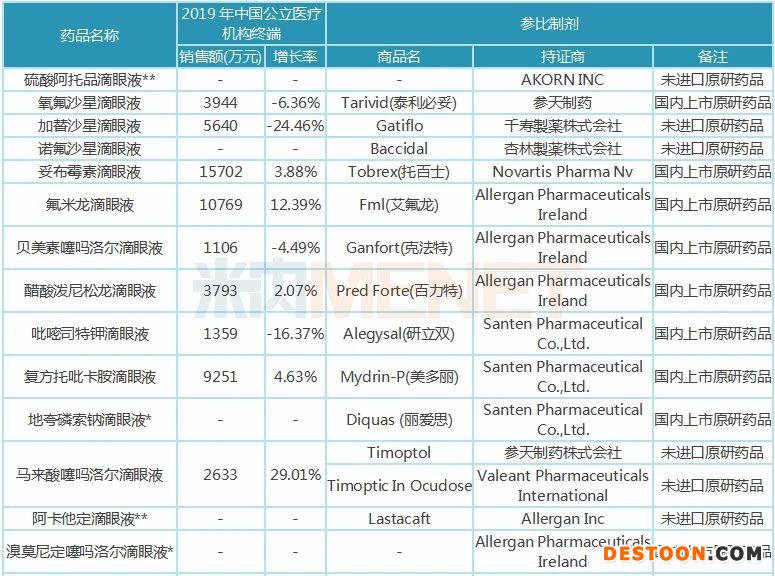 米內(nèi)網(wǎng)數(shù)據(jù)顯示,2019年中國(guó)城市公立醫(yī)院、縣級(jí)公立醫(yī)院、城市社區(qū)中心以及鄉(xiāng)鎮(zhèn)衛(wèi)生院(簡(jiǎn)稱中國(guó)公立醫(yī)療機(jī)構(gòu))終端眼用制劑(滴眼液、眼膏、眼凝膠等)市場(chǎng)規(guī)模接近70億元,TOP20產(chǎn)品中有18個(gè)為滴眼液。