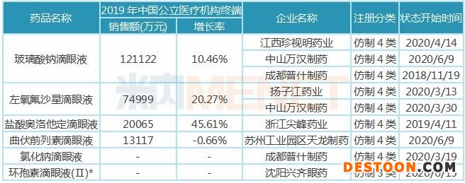 目前6個(gè)滴眼液已有企業(yè)通過或視同通過一致性評(píng)價(jià),玻璃酸鈉滴眼液過評(píng)企業(yè)數(shù)滿3家,該產(chǎn)品是2019年中國(guó)公立醫(yī)療機(jī)構(gòu)終端最暢銷的滴眼液;左氧氟沙星滴眼液過評(píng)企業(yè)數(shù)達(dá)2家,其銷售額僅次于玻璃酸鈉滴眼液,可見臨床應(yīng)用廣、市場(chǎng)潛力大的產(chǎn)品是企業(yè)重點(diǎn)布局的對(duì)象。