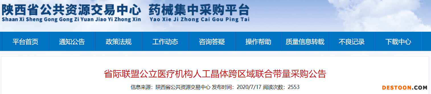 7月17日,陜西省公共資源交易中心發(fā)布《省際聯(lián)盟公立醫(yī)療機構(gòu)人工晶體跨區(qū)域聯(lián)合帶量采購文件》(下稱《采購文件》)表示,省際聯(lián)盟公立醫(yī)療機構(gòu)人工晶體跨區(qū)域聯(lián)合帶量采購工作自即日起開始實施。