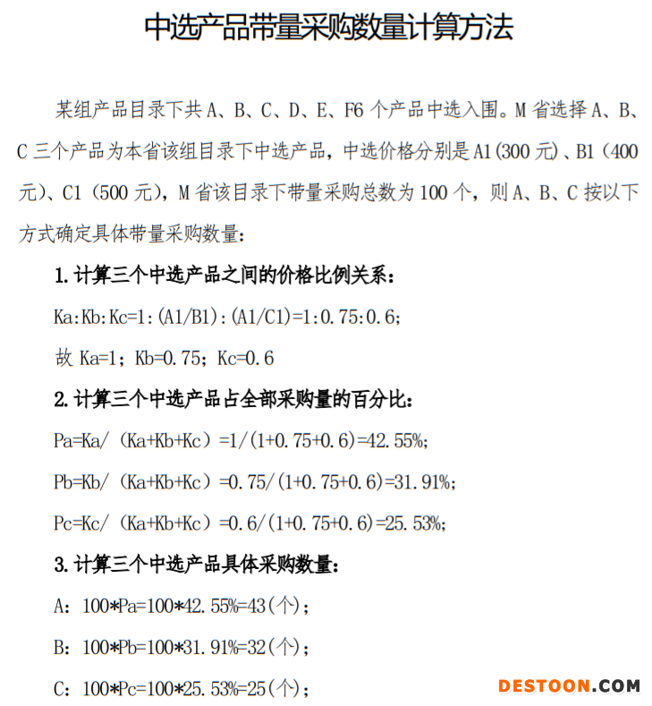 每個省(區(qū))從各組的中選產(chǎn)品中,確定本省該組的中選產(chǎn)品后,按中選產(chǎn)品價格之間的比例關(guān)系,具體計算每個中選產(chǎn)品的采購數(shù)量,舉例如下: