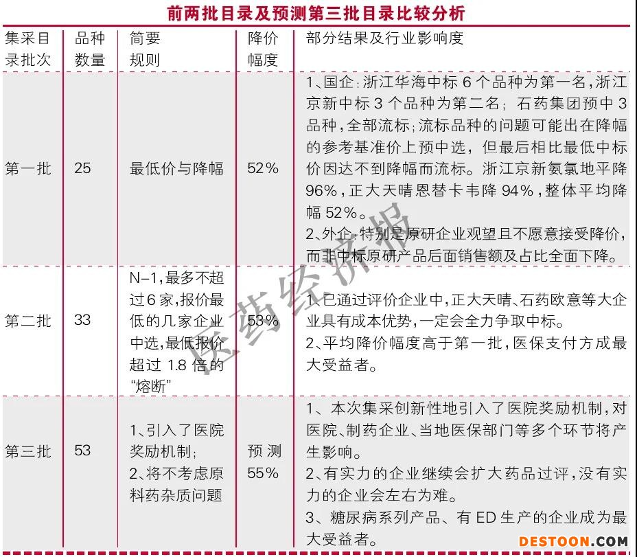 醫(yī)院市場(chǎng)已經(jīng)成為國家買單的主流市場(chǎng),其各項(xiàng)政策已經(jīng)是大企業(yè)展示的平臺(tái),成長(zhǎng)型企業(yè)或小藥企,因?yàn)槌杀?、品牌、營銷等各個(gè)方面的制約,都難以與大企業(yè)所抗衡,所以醫(yī)院市場(chǎng)轉(zhuǎn)戰(zhàn)至零售或基層醫(yī)療市場(chǎng)將是未來這些產(chǎn)品延長(zhǎng)生命周期的關(guān)鍵。而開拓新型領(lǐng)域同樣需要周期性的全方位投入,不轉(zhuǎn)型難以生存,轉(zhuǎn)型是否能夠成功,尚不能下結(jié)論。據(jù)北京旭日博遠(yuǎn)管理咨詢分析人士梳理,前兩批目錄及預(yù)測(cè)第三批目錄比較及行業(yè)影響度如表所示。