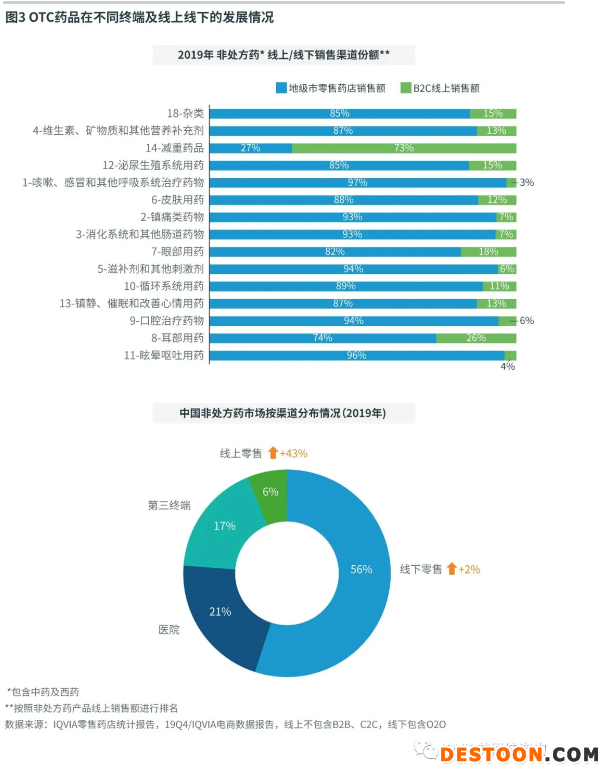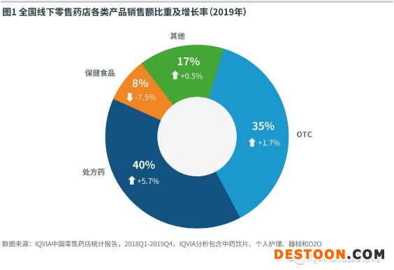 如果再加上中藥飲片、個人護理和器械,則2019年線下零售藥店整體規(guī)模約為3711億元。值得一提的是,受醫(yī)保政策限制非藥品類在藥店銷售和帶量采購政策推行、處方外流的影響,第二終端的藥品銷售占比持續(xù)提升——OTC和處方藥占據(jù)線下藥店整體市場的75%。(參見圖1)