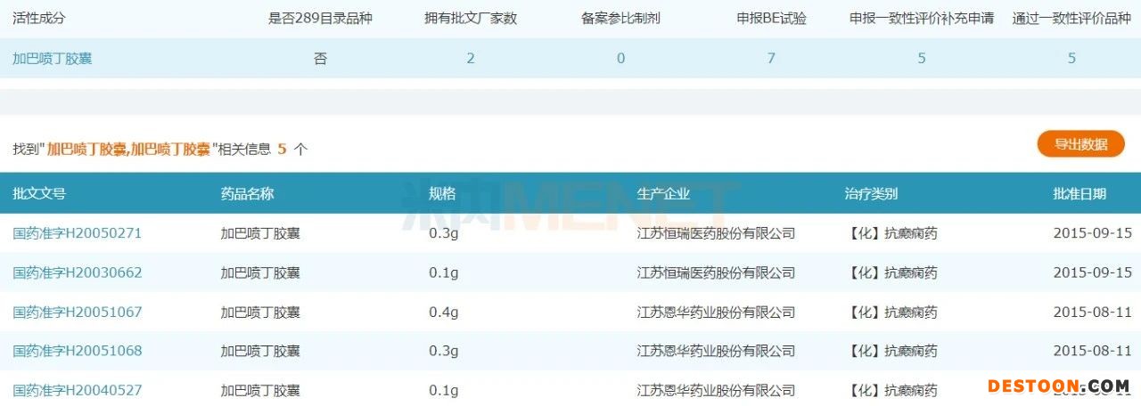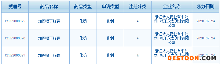 7月24日,CDE官網(wǎng)顯示,浙江永太藥業(yè)的加巴噴丁膠囊4類仿制上市申請獲得受理。米內(nèi)網(wǎng)數(shù)據(jù)顯示,2019年中國公立醫(yī)療機(jī)構(gòu)終端加巴噴丁膠囊劑銷售額達(dá)1.82億元,生產(chǎn)企業(yè)僅有恩華藥業(yè)和恒瑞醫(yī)藥兩家。