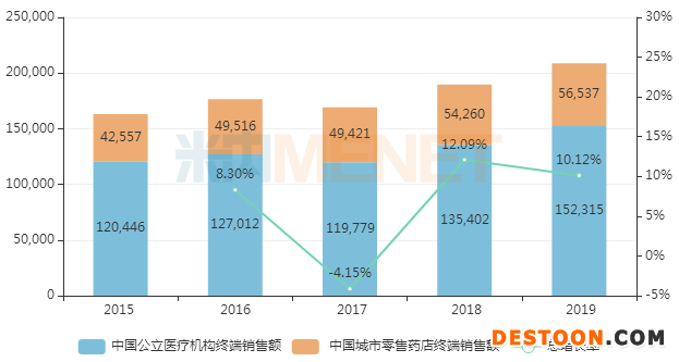 圖:2015-2019年中國(guó)公立醫(yī)療機(jī)構(gòu)及城市零售藥店終端替米沙坦銷售情況(單位:萬元)