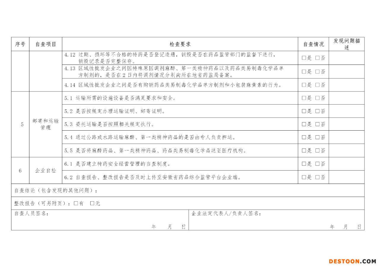 《自查通告》要求,特殊藥品經(jīng)營企業(yè)應(yīng)當(dāng)于每年6月30日前和12月31日前按照《特殊藥品經(jīng)營企業(yè)落實(shí)主體責(zé)任自查報(bào)告清單》各開展一次自查。