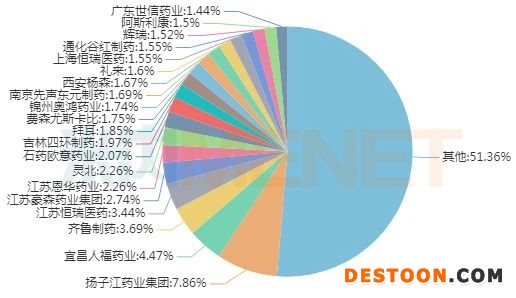 從廠家銷售格局來(lái)看,TOP10有8家是國(guó)內(nèi)企業(yè),外資企業(yè)僅有靈北和拜耳。而這8家國(guó)內(nèi)企業(yè)中有4家是江蘇的明星藥企,分別是揚(yáng)子江藥業(yè)、恒瑞醫(yī)藥、豪森藥業(yè)和恩華藥業(yè),4家合計(jì)市場(chǎng)份額超16%。