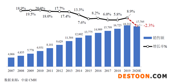 受疫情影響,2020年第1季度,藥品終端市場大幅下滑。預(yù)計2020年全年,中國藥品市場規(guī)模約為1.78萬億元,較2019年下降2.3%,將出現(xiàn)罕見負(fù)增長。