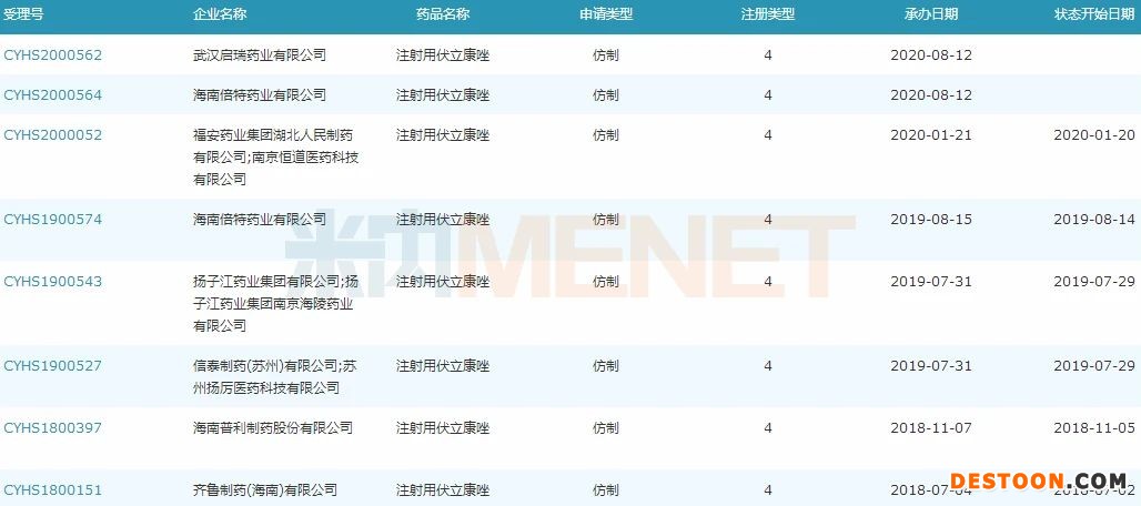從承辦日期看,齊魯制藥于2018年7月首家以新分類提交注射用伏立康唑上市申請,海南普利制藥緊接其后。海南倍特藥業(yè)于2019年8月提交該產(chǎn)品上市申請,2020年8月12日再次提交,推測為新品規(guī)報產(chǎn)。