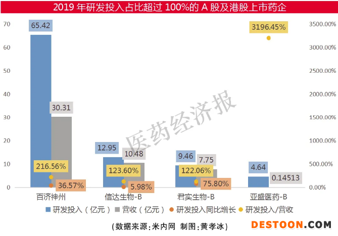 米內(nèi)網(wǎng)數(shù)據(jù)顯示,2019年A股及港股上市藥企中,研發(fā)投入突破1億元的有130家,其中超過10億元的有14家;超過八成藥企加強研發(fā)投入,6家同比增長超過100%;另有41家藥企研發(fā)投入占營收的比重超過10%,4家藥企研發(fā)投入占營收的比重超過100%。