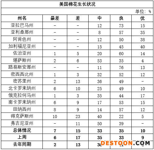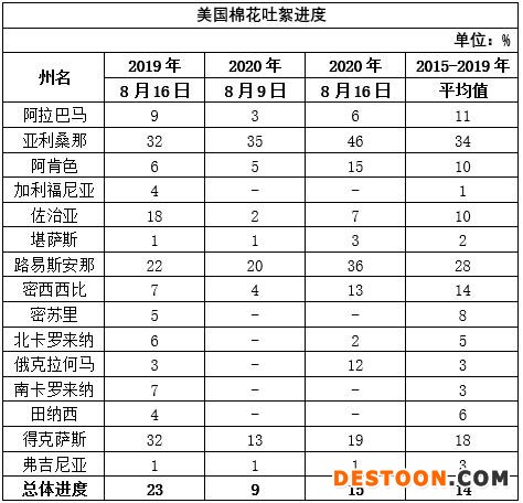 美國(guó)農(nóng)業(yè)部8月17日發(fā)布的美國(guó)棉花生產(chǎn)報(bào)告顯示,截至2020年8月16日,美國(guó)棉花結(jié)鈴進(jìn)度為80%,比去年同期減少3個(gè)百分點(diǎn),比過(guò)去五年平均值減少2個(gè)百分點(diǎn)。美國(guó)棉花吐絮進(jìn)度為15%,比去年同期減少8個(gè)百分點(diǎn),比過(guò)去五年平均值增加1個(gè)百分點(diǎn)。美國(guó)棉花生長(zhǎng)狀況達(dá)到良好以上的占45%,較前周增加3個(gè)百分點(diǎn),較去年同期減少4個(gè)百分點(diǎn)。其中得州優(yōu)良率為27%,較前周增加5個(gè)百分點(diǎn),差苗率為33%,較前周減少2個(gè)百分點(diǎn)。