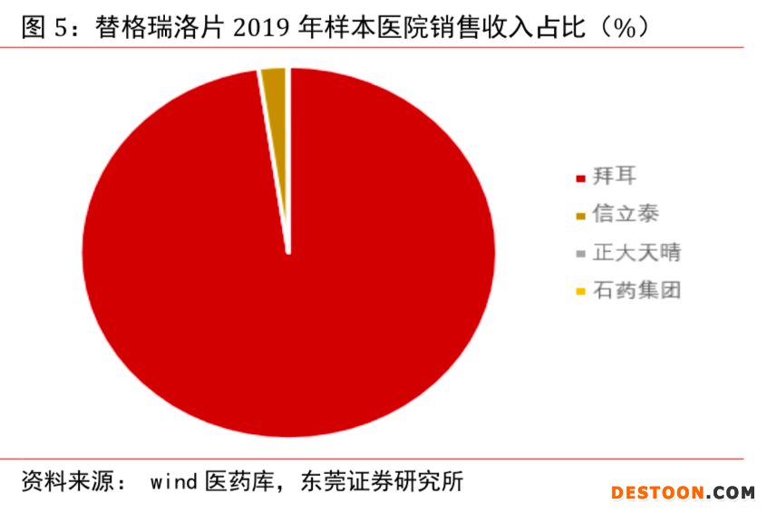 該品種也同樣是原研廠家占據(jù)絕大部分市場(chǎng)份額,2019 年替格瑞洛片國(guó)內(nèi)樣本醫(yī)院銷售額為 5.07 億元,阿斯利康銷售收入占比約為 97.69%,信立泰、正大天晴和石藥集團(tuán)銷售收入占比分別為 2.24%、0.04%和 0.02%。若這7家企業(yè)均申報(bào),將最多入圍5家。