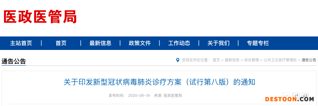 8月20日訊 8月19日,國家衛(wèi)健委發(fā)布《關(guān)于印發(fā)新型冠狀病毒肺炎診療方案(試行第八版)的通知》。