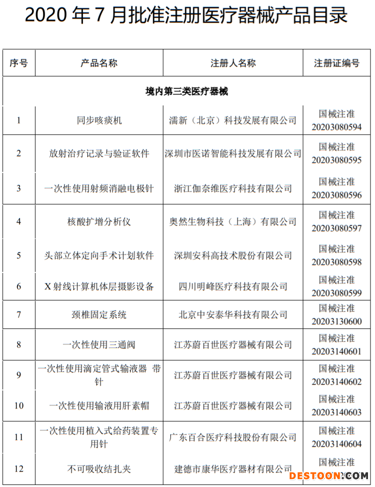 上述公告顯示,2020年7月,國(guó)家藥品監(jiān)督管理局共批準(zhǔn)注冊(cè)醫(yī)療器械產(chǎn)品102個(gè)。其中,境內(nèi)第三類醫(yī)療器械產(chǎn)品73個(gè),進(jìn)口第三類醫(yī)療器械產(chǎn)品11個(gè),進(jìn)口第二類醫(yī)療器械產(chǎn)品17個(gè),港澳臺(tái)醫(yī)療器械產(chǎn)品1個(gè)。