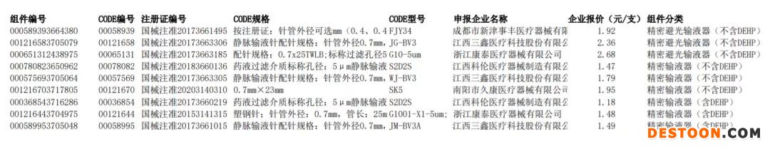 一次性使用精密輸液器擬中選企業(yè)包括成都市新津事豐醫(yī)療器械有限公司、江西三鑫醫(yī)療科技股份有限公司、浙江康泰醫(yī)療器械有限公司等,上述三家企業(yè)報價分別為1.92元、2.36元、2.68元。