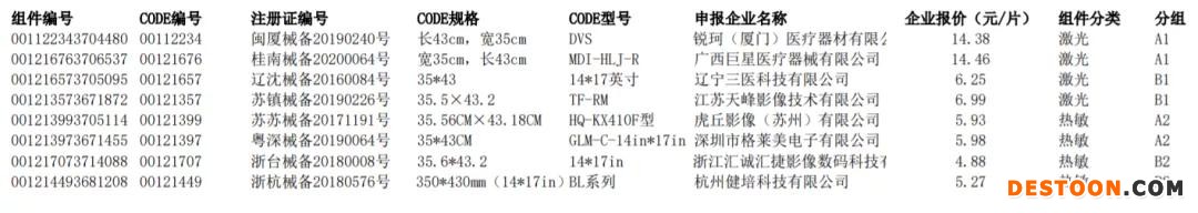醫(yī)用膠片擬中選企業(yè)包括銳珂(廈門)醫(yī)療器材有限公司、廣西巨星醫(yī)療器械有限公司、遼寧三醫(yī)科技有限公司等,上述三家企業(yè)報價分別為14.38元、14.46元、6.25元。
