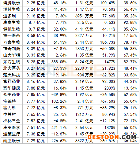 凈利潤(rùn)TOP10中,邁瑞醫(yī)療、恒瑞醫(yī)藥、云南白藥等5家超過(guò)20億元。其中,“醫(yī)械一哥”邁瑞醫(yī)療以34.54億元居首位,恒瑞醫(yī)藥則緊跟其后;維生素龍頭企業(yè)新和成凈利潤(rùn)增速最快,高達(dá)91.41%。