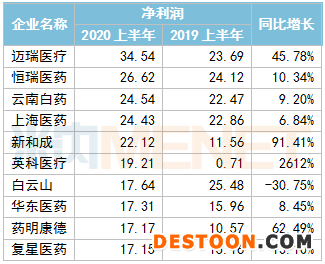 A股醫(yī)藥企業(yè)2020上半年凈利潤(rùn)TOP10(單位:億元)