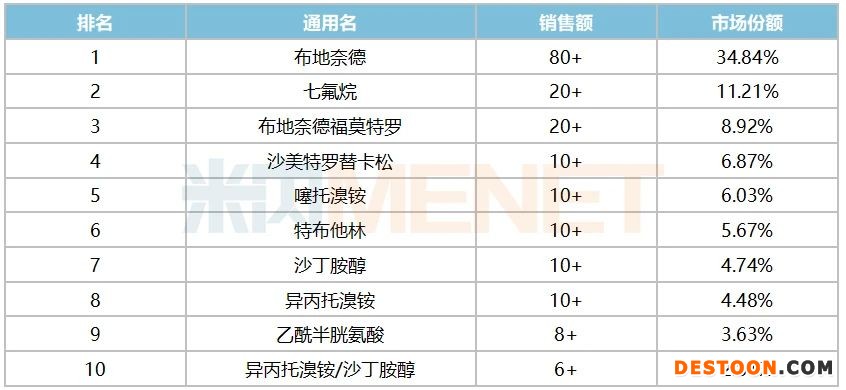 表1:中國公立醫(yī)療機構(gòu)終端化學藥吸入劑TOP10品種(單位:億元)