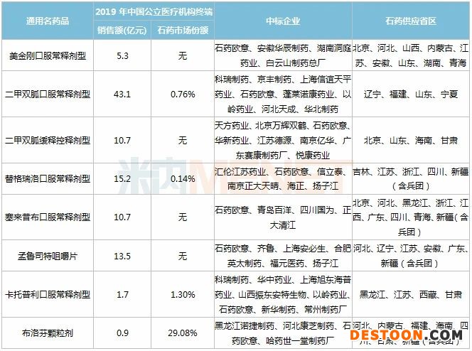 2019年中國公立醫(yī)療機(jī)構(gòu)終端競爭格局中,石藥在美金剛口服常釋劑型、二甲雙胍口服常釋劑型、二甲雙胍緩釋控釋劑型、替格瑞洛口服常釋劑型、塞來昔布口服常釋劑型、孟魯司特咀嚼片、卡托普利口服常釋劑型7個(gè)品種所占市場份額較低或?yàn)?,中標(biāo)后有望迅速開拓市場。