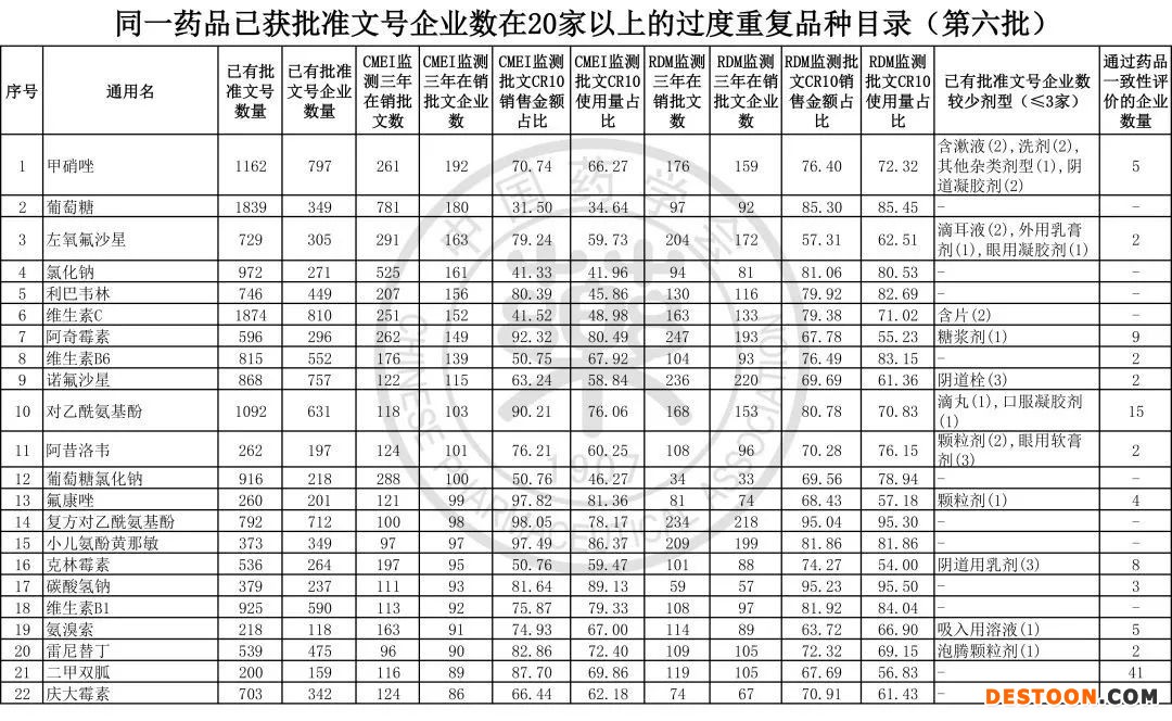 自2014年9月原國(guó)家食藥監(jiān)總局公布《第一批過(guò)度重復(fù)藥品品種目錄》,目前已是第六批。梳理公布的目錄發(fā)現(xiàn),過(guò)度重復(fù)藥品已經(jīng)有大量企業(yè)生產(chǎn)或正在申報(bào)投產(chǎn),市場(chǎng)需求已經(jīng)飽和或者接近飽和。