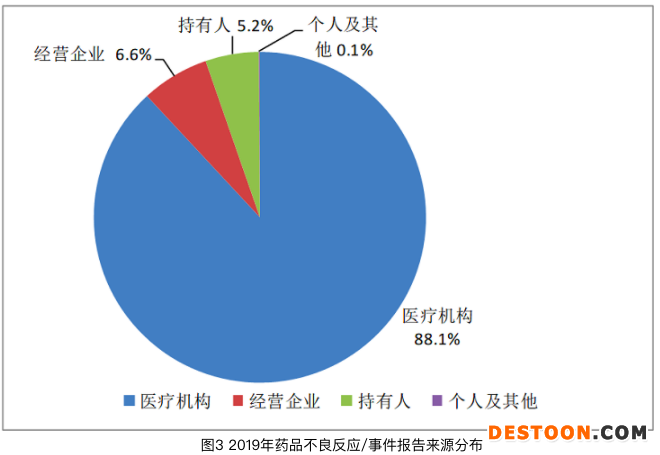 從《國家藥品不良反應(yīng)監(jiān)測年度報(bào)告(2019年)》數(shù)據(jù)統(tǒng)計(jì)來看,2019年來自醫(yī)療機(jī)構(gòu)的報(bào)告占88.1%;來自經(jīng)營企業(yè)的報(bào)告占6.6%;來自持有人的報(bào)告占5.2%;來自個(gè)人及其他報(bào)告者的報(bào)告占0.1%。